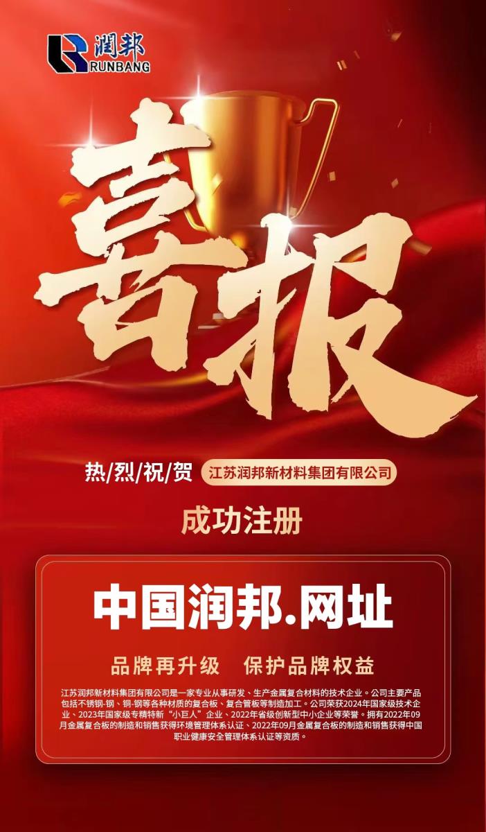 江蘇潤(rùn)邦新材料集團(tuán)有限公司是一家專業(yè)從事研發(fā)、生產(chǎn)金屬?gòu)?fù)合材料的技術(shù)企業(yè)。公司主要產(chǎn)品包括不銹鋼-鋼、銅-鋼等各種材質(zhì)的復(fù)合板、復(fù)合管板等制造加工。